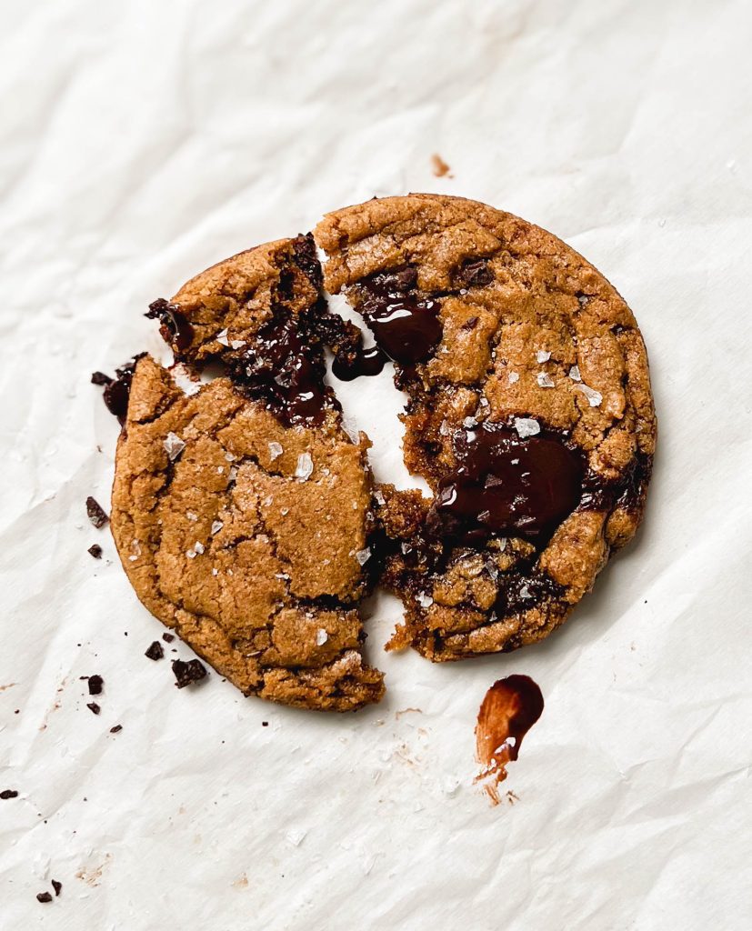 5 – Scoop the frozen dough out of the bowl, divide it into two, and roll each piece of dough into a tight ball. Place both cookie dough balls on the prepared baking sheet, evenly spaced apart, and bake in the oven for 11-12 minutes or until the edges are golden-brown and the middle is still gooey. Remove from the oven and bang the pan on the counter 5-6 times; this will give your cookie that signature tortoiseshell look. Let cool for 8-10 minutes; it’ll continue to cook as it cools on the counter.