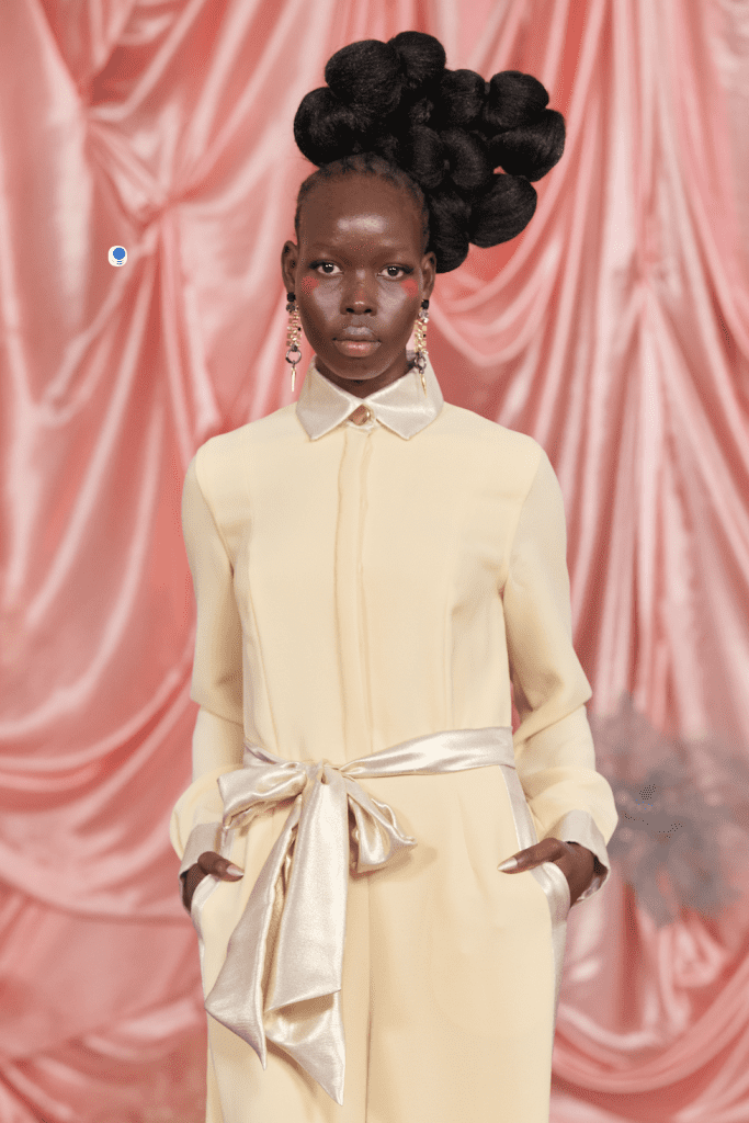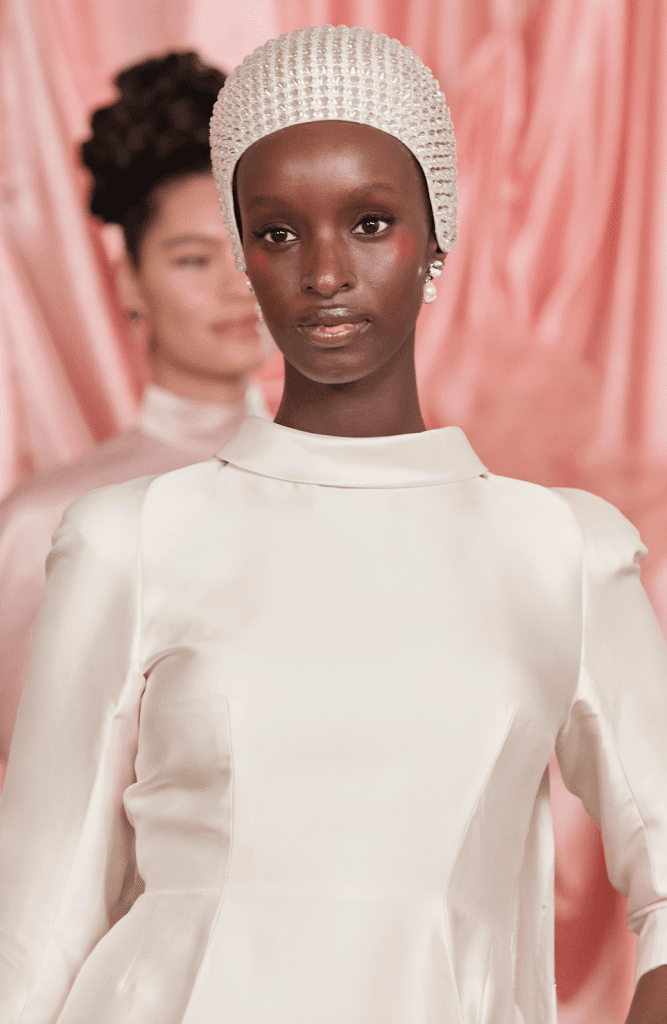 The garments in this collection are adorned with clear and glittering crystals that catch the light, especially on the shoulders of capelettes and the stunning Bell Jacket. These crystals are expertly placed on a beautifully embellished headpiece by Piers Atkinson, adding a touch of glamour to the bride’s overall look. To complement the stunning attire, the hair styling by Nick Irwin and the Schwarzkopf Pro team is inspired by the Victorian era, featuring soft and fluffy textures reminiscent of candy floss, elegantly styled into modern chignons with swirls atop an intricately woven cornrow base.
